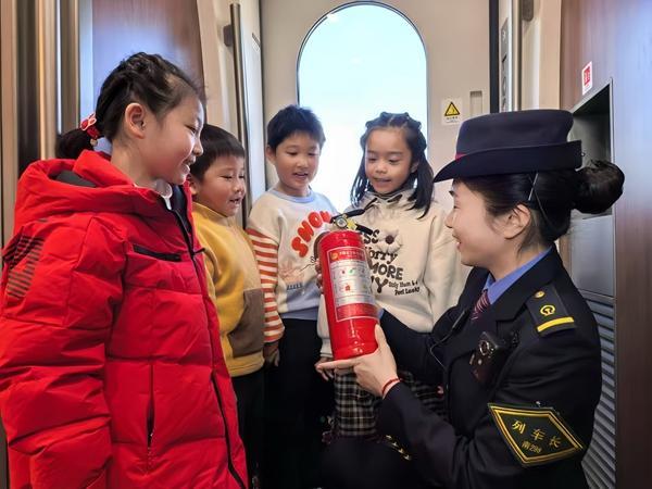 春運期間,南昌客運段組織開展安全乘車小課堂。圖為(wei) G1584次列車乘務員在給小朋友講解列車消防設備設施的使用。王夢婧子/攝