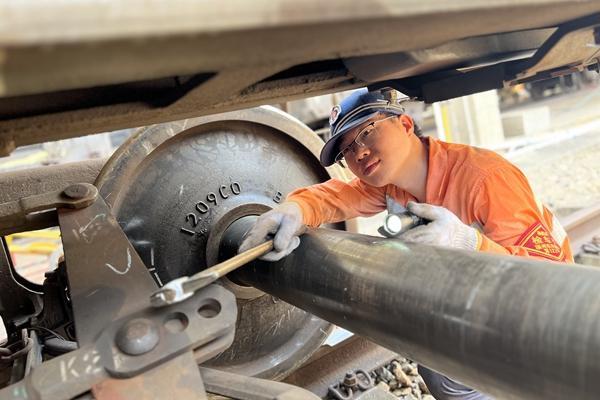 1時30分,作業(ye) 人員攜帶道尺、檢查錘、油壺等材料工具,向站場西邊進發,點點頭燈猶如點點螢光,緩緩向前方移動。10分鍾後,左自強抵達14號道岔,他彎下腰,將道尺卡在鋼軌間讀取數值。“0.5、0.4、0.5……”他邊檢查邊記錄,不放過一處問題隱患。在一顆鬆動螺栓處,左自強先用手旋緊,再用扳手緊固,最後雙手用力下壓扳手,直至螺栓紋絲(si) 不動。“一顆螺栓鬆動,就可能帶來重大安全隱患。再細小的事情我們(men) 也要認真仔細地做好。”左自強說。