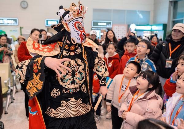 1月30日,Y987次“非遺主題”熊貓專(zhuan) 列出發前,變臉演員正在與(yu) 小遊客互動。孟寬/攝