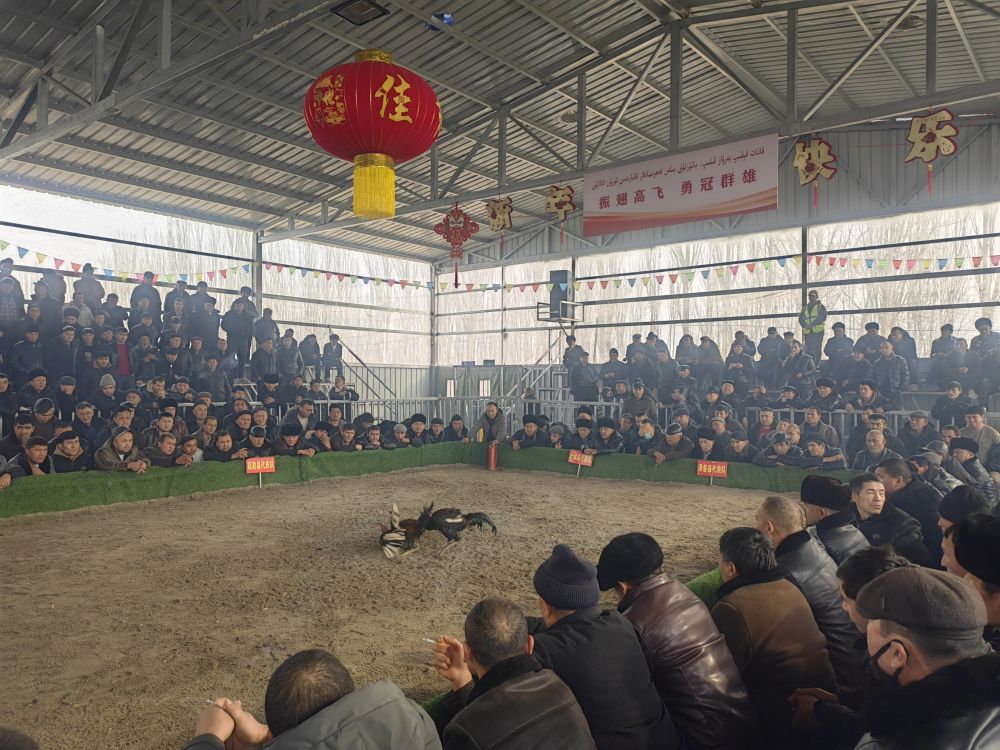 1月5日,在新疆喀什市牛羊大巴紮,觀眾(zhong) 在觀看鬥雞比賽。新華社記者蔡國棟 攝