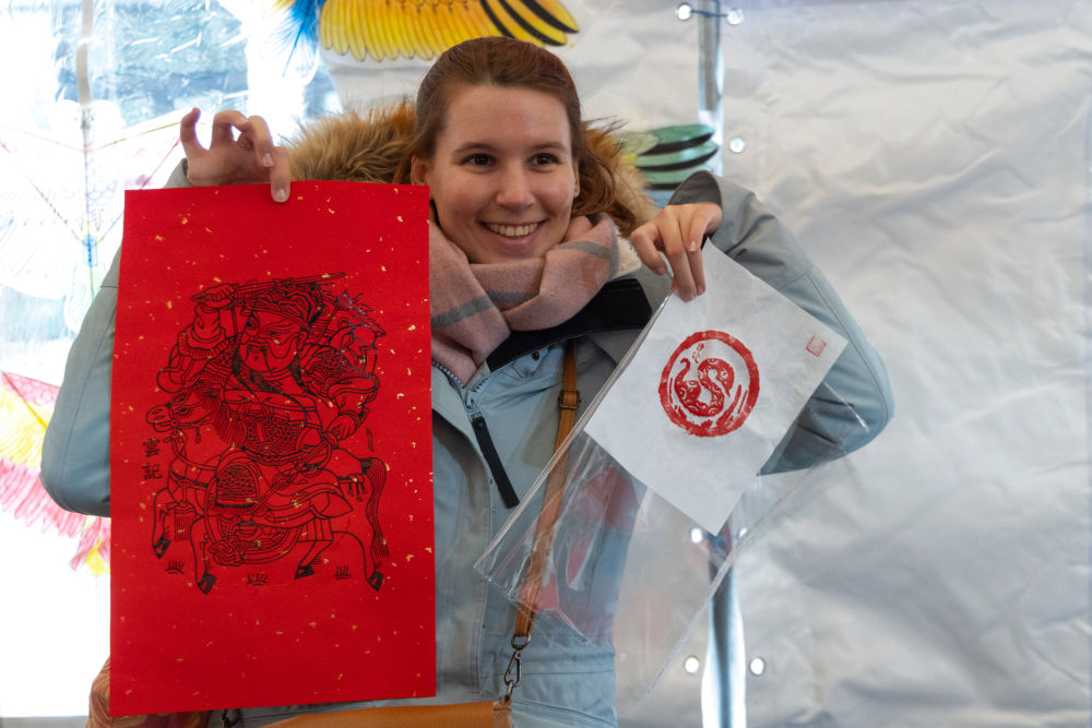 1月18日,一名女子在匈牙利首都布達佩斯舉(ju) 行的新春廟會(hui) 活動上手持木版年畫留影。新華社發(弗爾季·奧蒂洛攝)