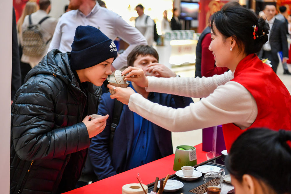 1月28日,在俄羅斯莫斯科舉(ju) 行的新春廟會(hui) 活動上,遊客在感受茶文化。新華社記者曹陽攝