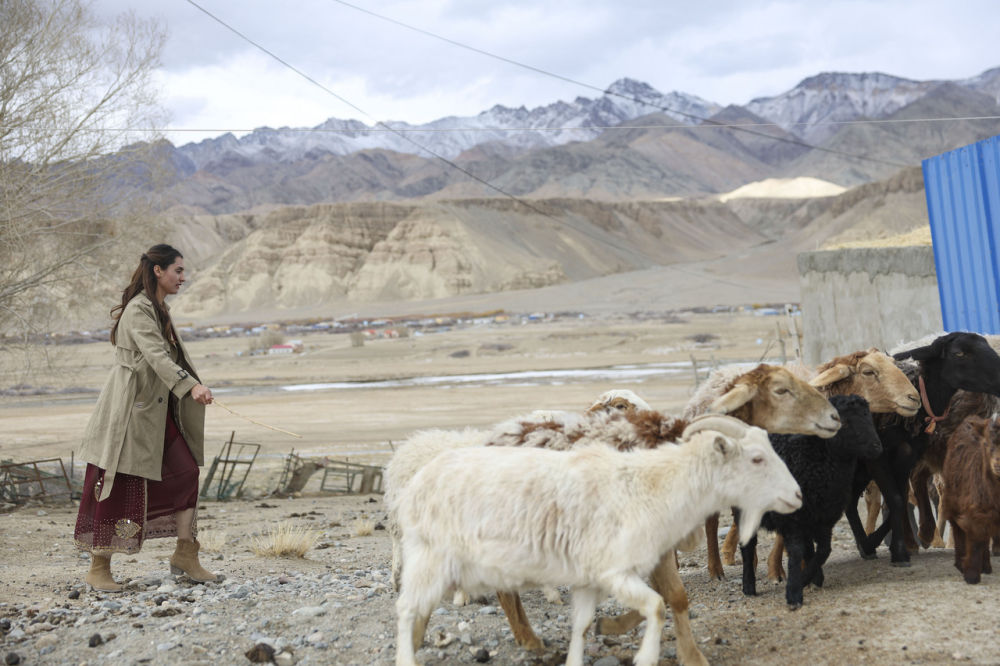 在瓦恰鄉(xiang) 夏布孜喀拉村,艾爾開牙·多力開幫忙將羊群趕回羊圈(2024年3月22日攝)。