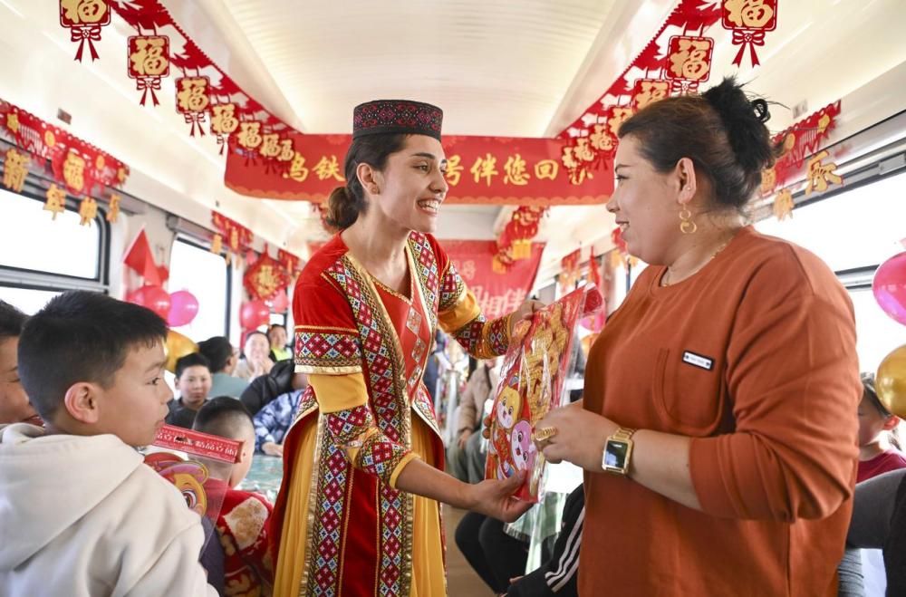 在喀什開往成都西的列車上,艾爾開牙·多力開(左)向參與(yu) “列車春晚”互動遊戲的乘客贈送福字年畫(2025年1月17日攝)。