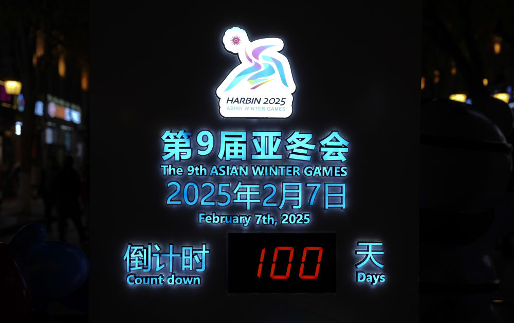 這是2024年10月30日在哈爾濱中央大街上拍攝的亞(ya) 冬會(hui) 倒計時牌。當日是2025年第九屆亞(ya) 洲冬季運動會(hui) 倒計時100天。