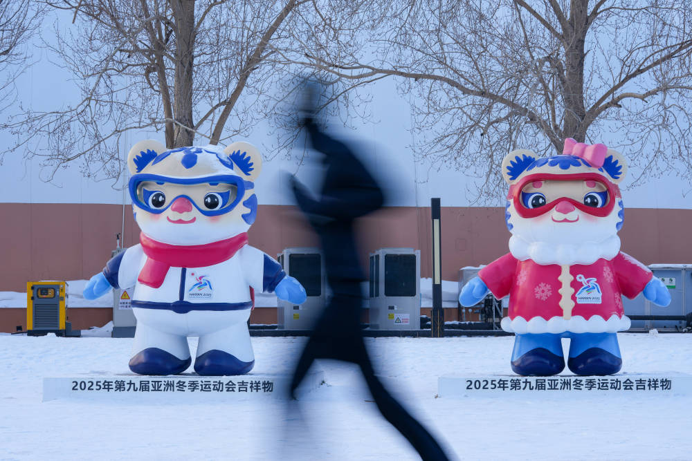 2025年1月8日,在哈爾濱湘江公園,跑步的市民從(cong) 亞(ya) 冬會(hui) 吉祥物雕塑前經過。