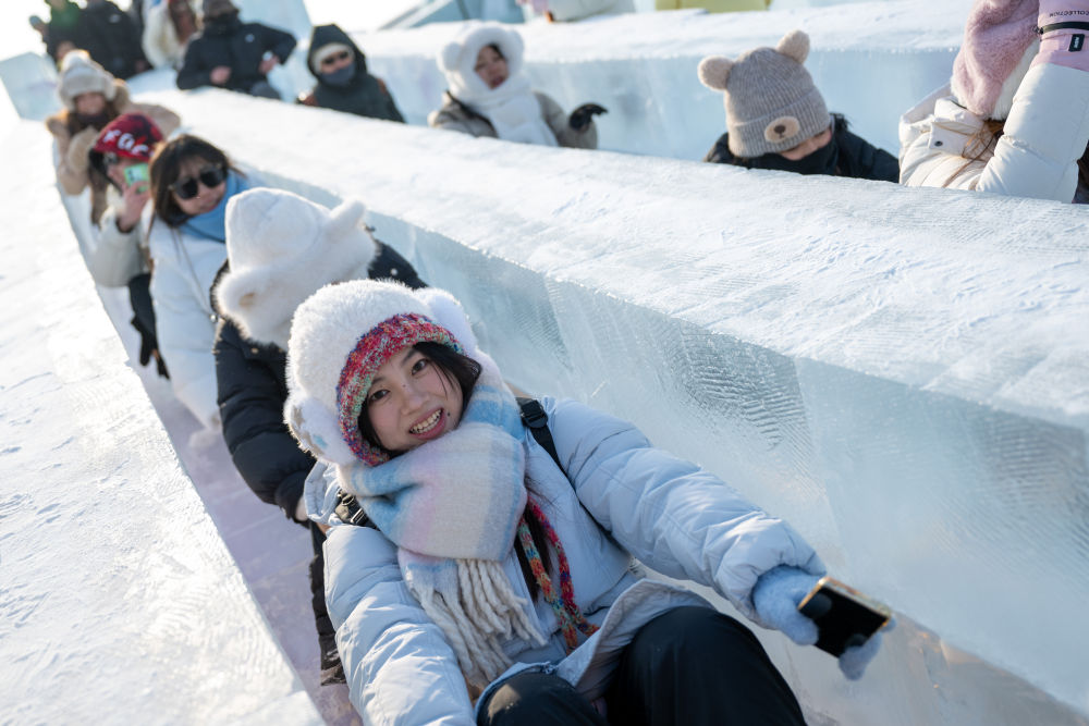 2024年12月21日,遊客在哈爾濱冰雪大世界園區內(nei) 玩滑梯。