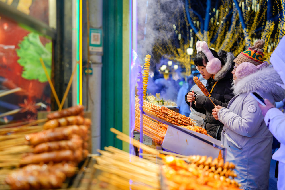 2025年1月30日,遊客在哈爾濱中央大街上品嚐烤腸。