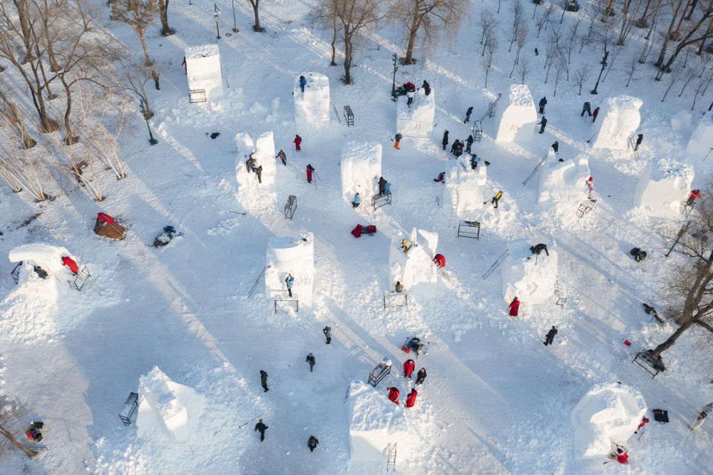 2025年1月6日,第27屆哈爾濱國際雪雕比賽參賽選手在雕刻雪雕作品。來自10個(ge) 國家20餘(yu) 支代表隊的雪雕藝術家在哈爾濱太陽島雪博會(hui) 園區同場競技。
