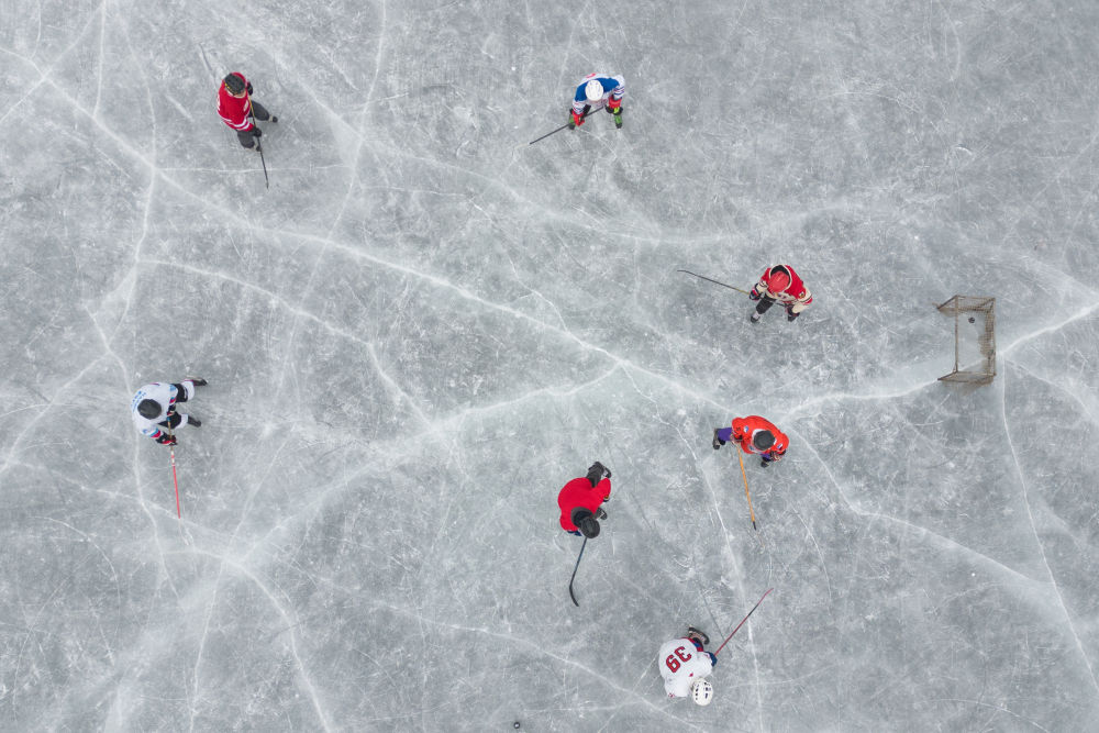2025年1月7日,冰球愛好者在哈爾濱丁香公園的冰麵上打冰球。