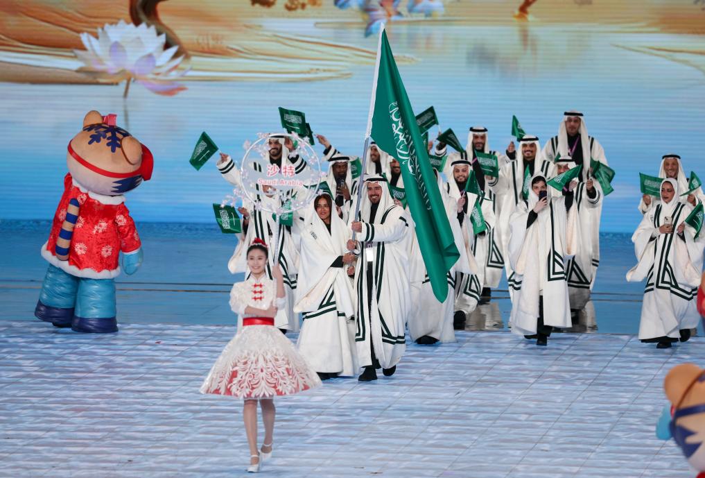 2月7日,沙特阿拉伯體(ti) 育代表團在第九屆亞(ya) 洲冬季運動會(hui) 開幕式上入場。新華社記者 楊磊 攝