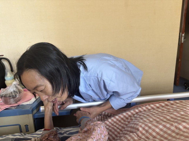 來自黑龍江省的李世娟,今年55歲,因為(wei) 年紀原因本想從(cong) 事育兒(er) 嫂工作的她隻能從(cong) 事護理工作。“家政公司說雇主更想要年輕些的阿姨帶孩子。”輾轉之下,她考取了護工資格證,成為(wei) 一名老年護理員。“這是我照顧的第二位老人”她輕聲說。第一位老人出院時,家屬本想帶她走,她婉拒了,“看著他們(men) 好起來我也高興(xing) ,但這裏總有更需要我的人。”談話間,90床奶奶的兒(er) 子來探望老母親(qin) ,輕摸著奶奶的頭一遍又一遍地問著“睜眼看看,我是誰呀”,奶奶也是含糊不清地說著“不知道”,兒(er) 子半開玩笑地說“傻老太太”。李世娟在一旁緊忙說:“你不要說她傻啊,糊塗啊,因為(wei) 患有阿爾茲(zi) 海默症的人有時是清醒的,一聽你說她傻她就覺得自己好像是傻了”,李世娟向記者說,自己平日很喜歡看健康教育節目,見到認識的人也會(hui) 多科普幾句,“我姑娘說,媽你別老給人家上課,我說媽那不是上課,隻是想把自己知道的分享給人家”,李世娟一邊說,一邊難掩苦笑。
