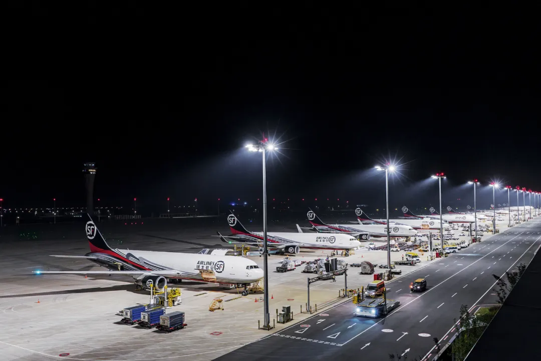 圖為(wei) 夜幕下的花湖機場上,順豐(feng) 航空的地勤人員正在繁忙作業(ye) 。順豐(feng) 鄂州樞紐供圖