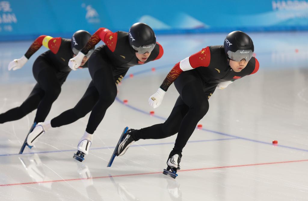2月10日,中國隊選手高亭宇(右)、寧忠岩、廉子文(中)在比賽中。當日,第九屆亞(ya) 冬會(hui) 速度滑冰男子短距離團體(ti) 追逐賽在哈爾濱舉(ju) 行。中國隊獲得冠軍(jun) 。新華社記者 呂帥 攝