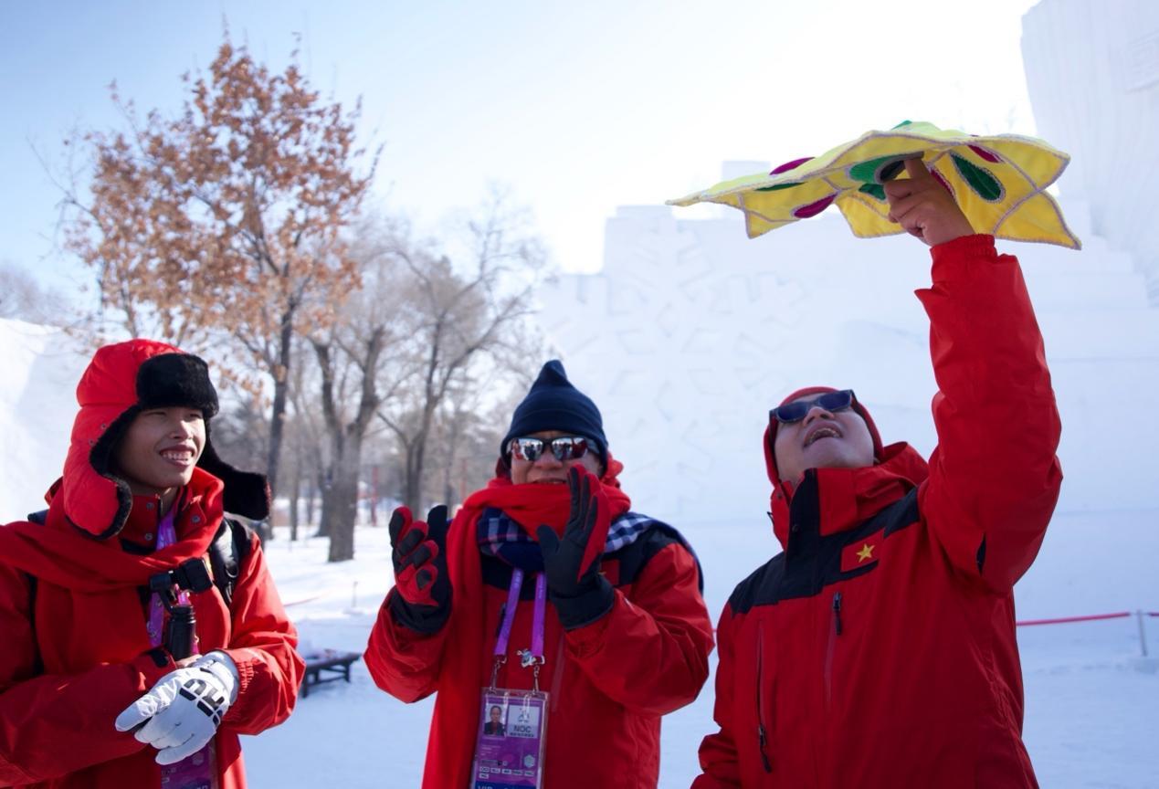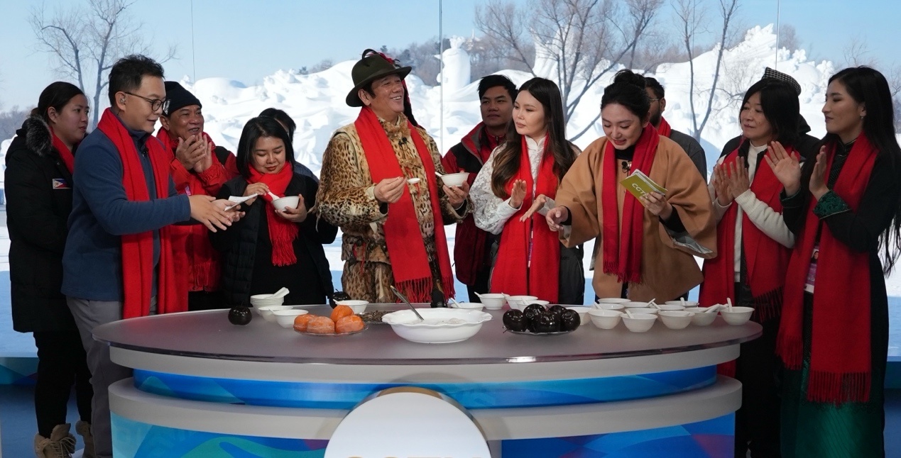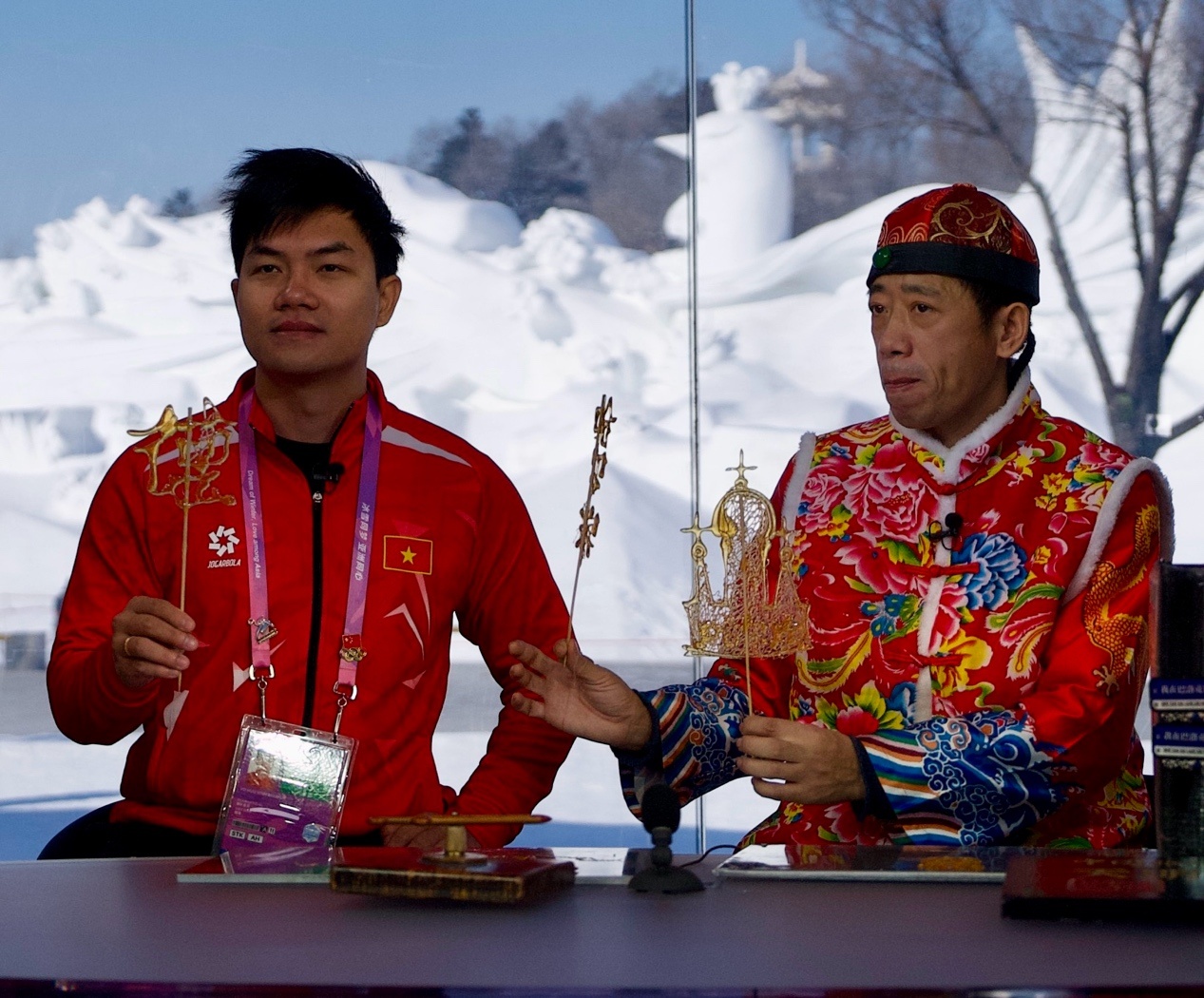 來自蒙古國、泰國、菲律賓、越南、印度、尼泊爾等國的近20位運動員、體(ti) 育代表團官員和媒體(ti) 人,在賽場上比拚之後,歡聚在哈爾濱太陽島雪博會(hui) 中央廣播電視總台的演播室,在冰天雪地中共慶新春。