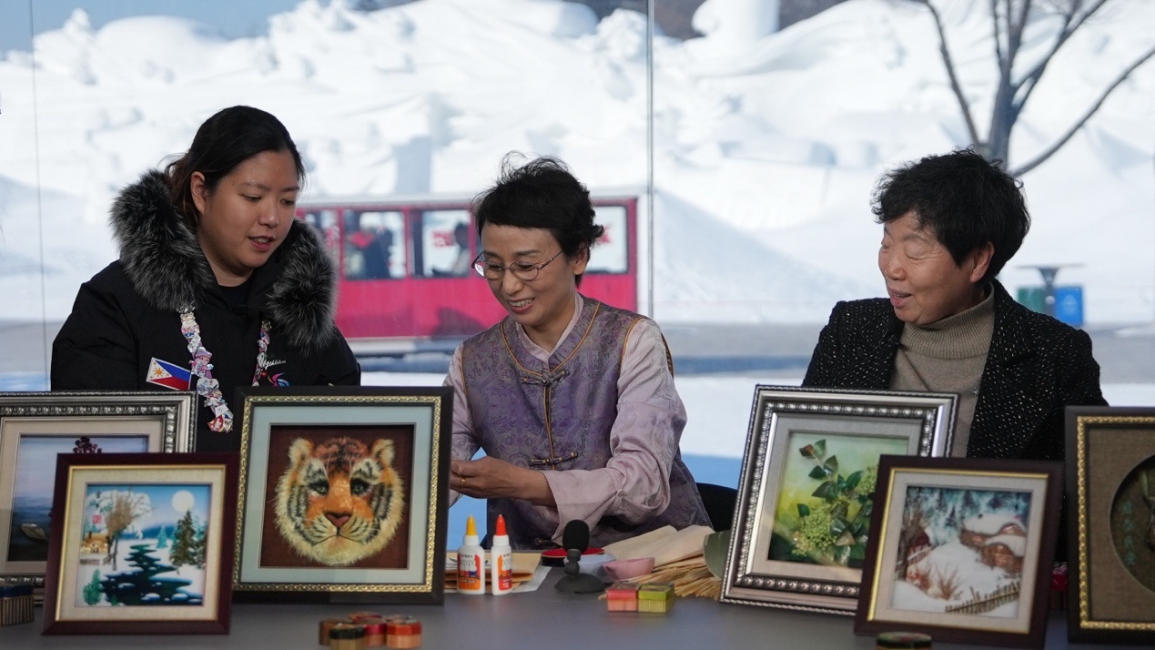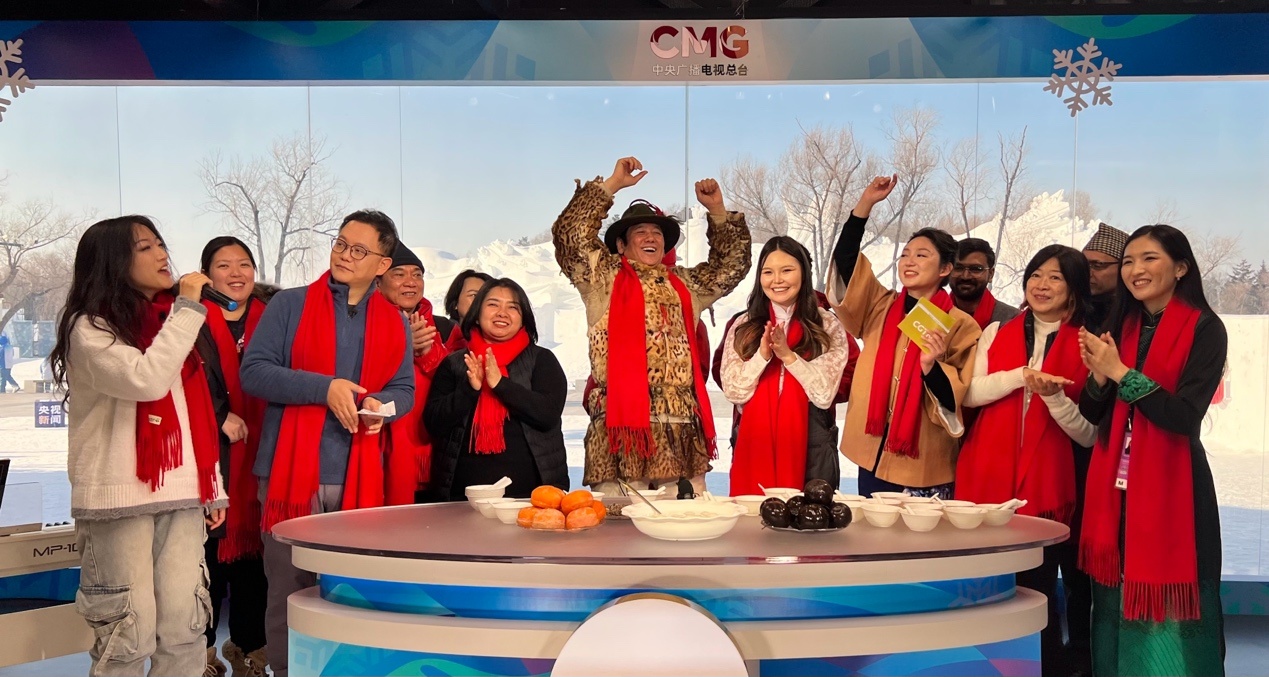 參加“當亞(ya) 冬會(hui) 遇上‘非遺年’”人文交流活動的中外嘉賓在哈爾濱太陽島雪博會(hui) CMG演播室同慶新春