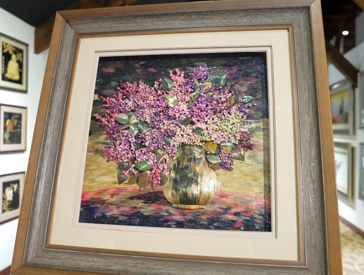 麥秸畫是以生長在東(dong) 北黑土地上的麥稈為(wei) 原料,利用其自然光澤、紋理和質感,經過選料、泡、煮、染、刮等十幾道手工製作工序,將花卉、風景、建築、人物、動物等生動形象地表現出來。
