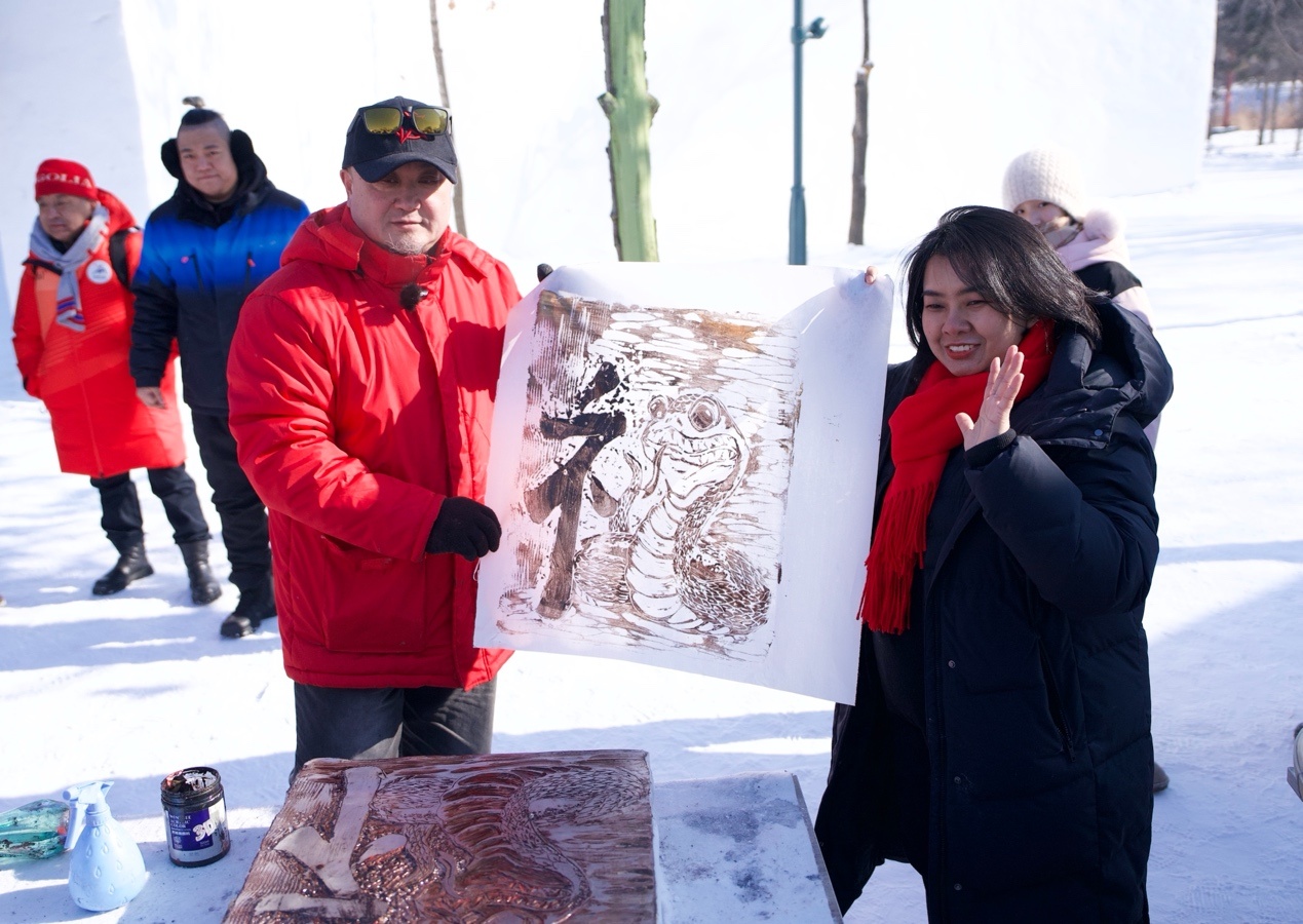 泰國駐華大使館二等秘書(shu) 王安安在黑龍江省藝術研究院冰版畫研究院副院長盛琰的指導下,製作出冰版畫《畫蛇添福》,用蛇的形狀和漢字的偏旁部首組合雕刻出漢字“福”並拓印出來,寄托對中國農(nong) 曆蛇年的祝福。