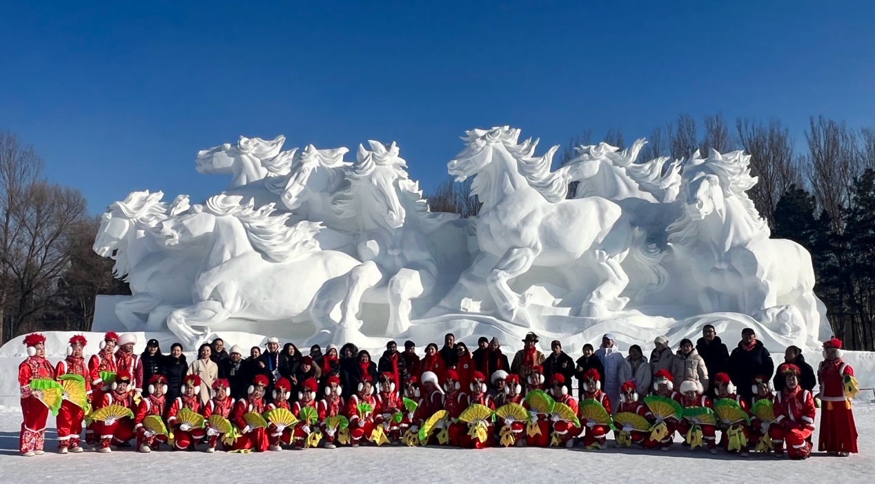 參加活動的中外友人在雪博會(hui) 雪雕作品《八駿踏雪》前合影