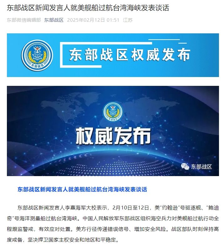 東(dong) 部戰區新聞發言人李熹海軍(jun) 大校表示,2月10日至12日,美“約翰遜”號驅逐艦、“鮑迪奇”號海洋測量船過航台灣海峽。中國人民解放軍(jun) 東(dong) 部戰區組織海空兵力對美艦船過航行動全程跟監警戒,有效應對處置。美方行徑傳(chuan) 遞錯誤信號、增加安全風險。戰區部隊時刻保持高度戒備,堅決(jue) 捍衛國家主權安全和地區和平穩定。
