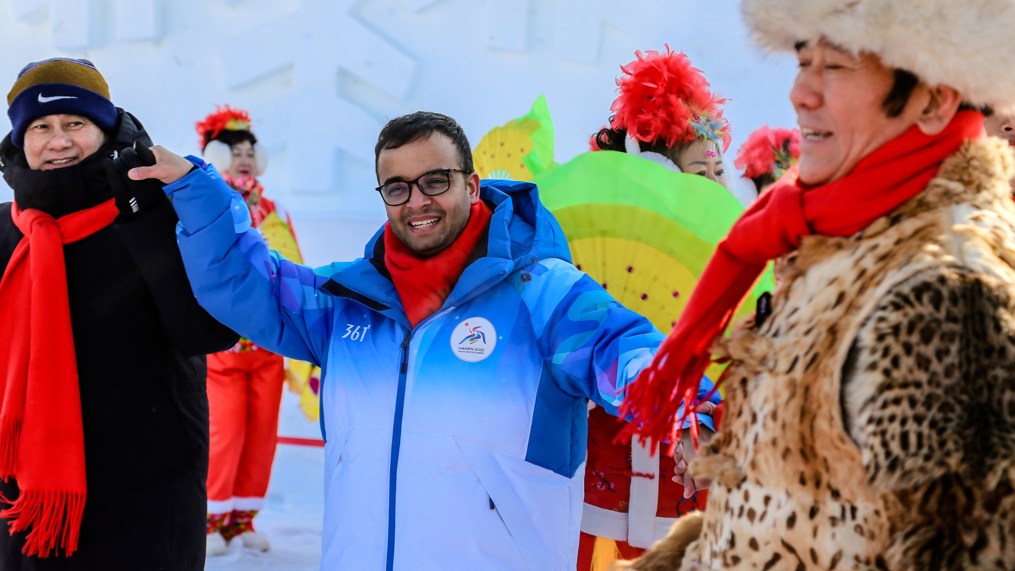 第九屆亞(ya) 冬會(hui) 在哈爾濱舉(ju) 辦期間,一場主題為(wei) “當亞(ya) 冬會(hui) 遇上非遺年——亞(ya) 洲多國人士冰城同慶新春”的人文交流活動在哈爾濱舉(ju) 行。活動當天,在哈爾濱雪博會(hui) 中央廣播電視總台演播室前的廣場上,20多人組成的民間秧歌隊在哈爾濱中央大街形象大使甲繼海的帶領下,為(wei) 各國來賓激情演繹迎賓秧歌舞。