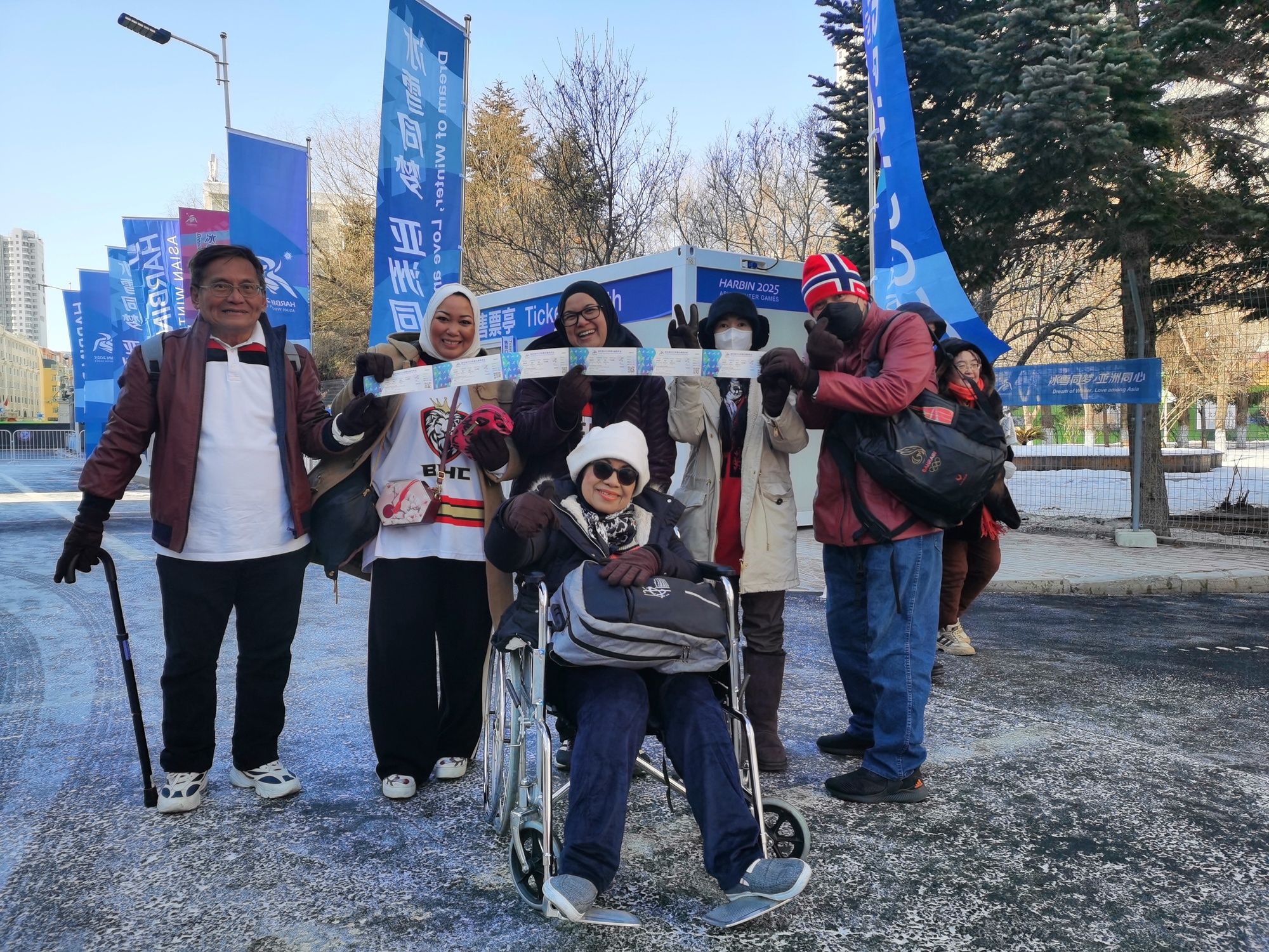 阿伊莎(後排左二)一家六口在亞(ya) 冬會(hui) 賽場外合影