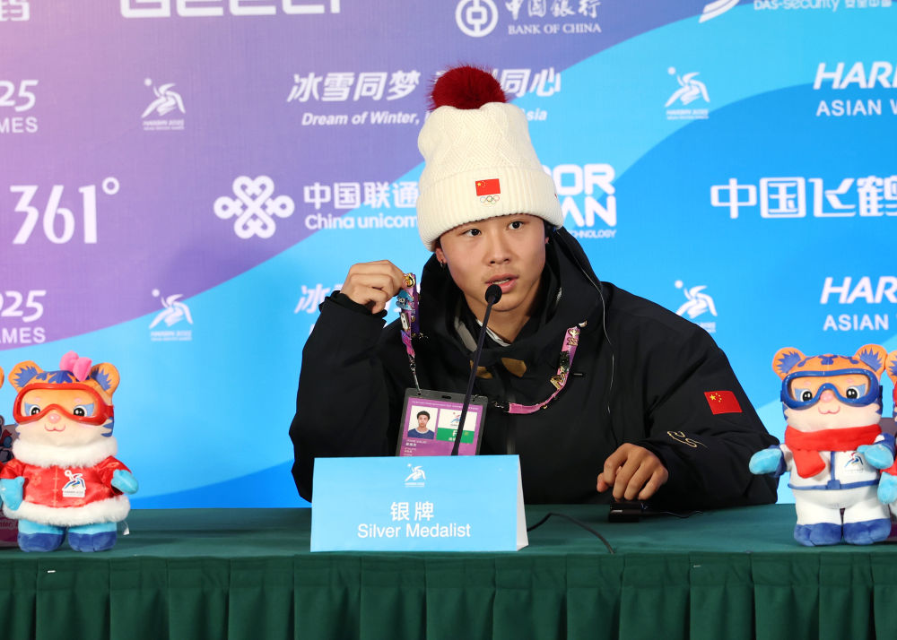 2月10日,中國選手薑鑫傑在發布會(hui) 現場介紹他與(yu) 其他運動員交換來的徽章。新華社記者 張晨霖 攝