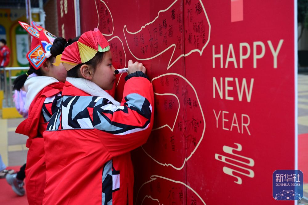 2月14日,在合肥市園上園小學喻崗分校,學生參加畫蛇添“福”活動。新華社記者 周牧 攝