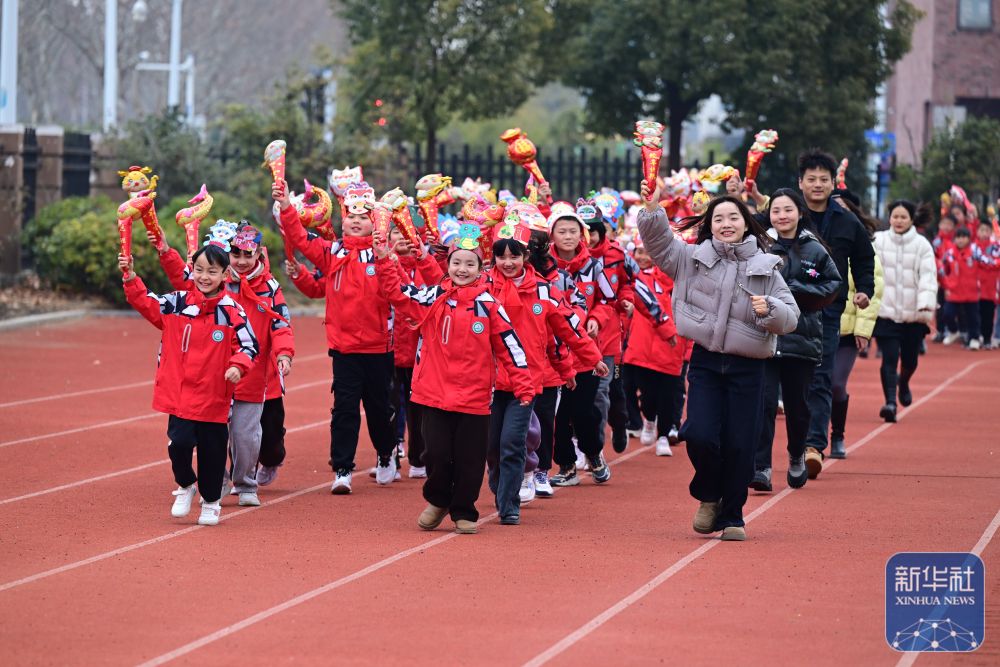 2月14日,合肥市園上園小學喻崗分校師生在開學典禮上進行“貪吃蛇”接力跑活動。新華社記者 周牧 攝