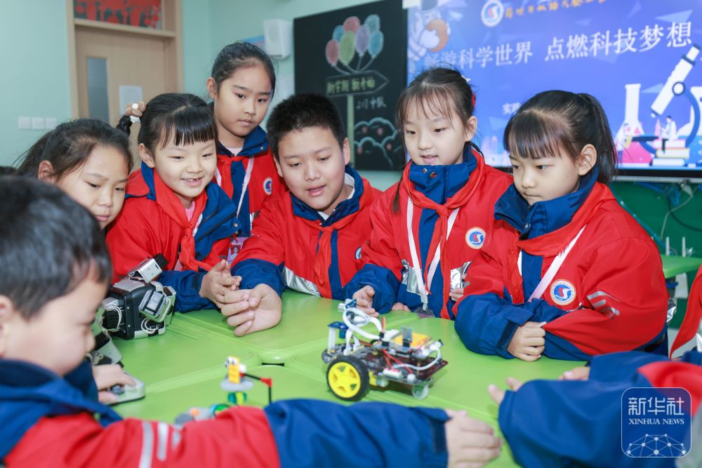 2月14日,在山東(dong) 省棗莊市薛城區雙語實驗小學,學生們(men) 與(yu) 編程機器人互動。新華社發(王龍飛攝)