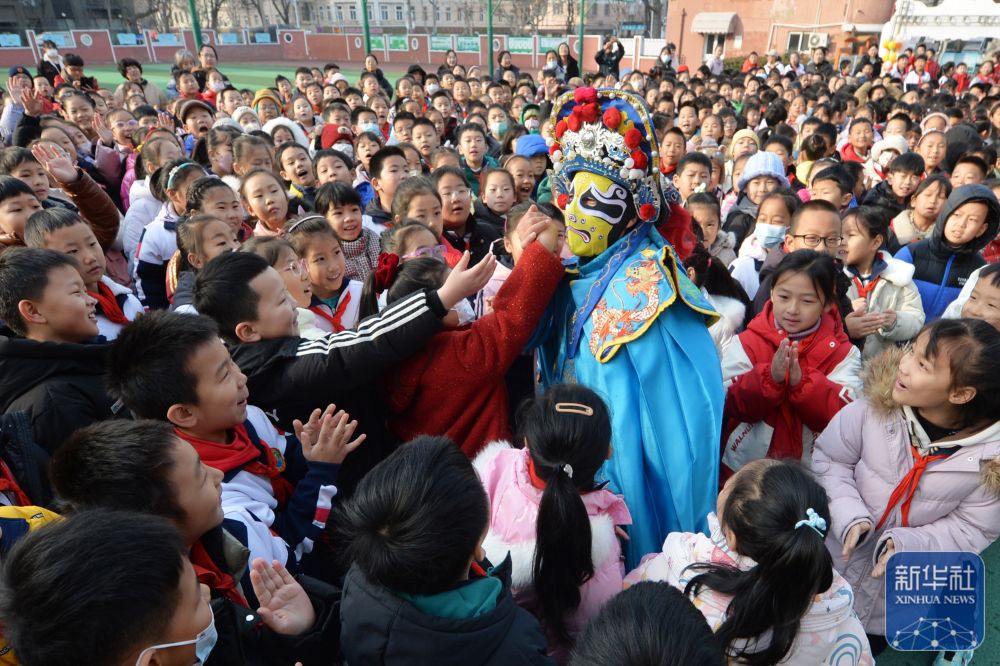 2月14日,學生們(men) 在山東(dong) 青島四方小學“傳(chuan) 統文化潤童心”主題活動中與(yu) 川劇變臉演員互動。新華社發(王海濱攝)