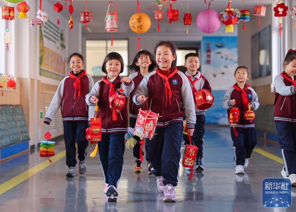 2月14日,在山東(dong) 省榮成市實驗小學,學生們(men) 展示自己的手工作品。新華社發(李信君攝)