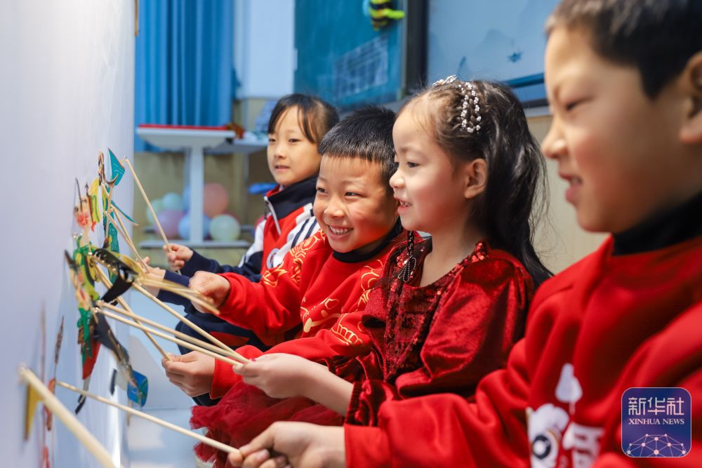 2月14日,學生在山東(dong) 省青島崇禮小學體(ti) 驗皮影戲表演。新華社發(張鷹攝)