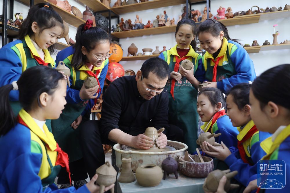 2月14日,在山東(dong) 省滕州市龍泉街道中心小學,老師在教學生們(men) 製作土陶。新華社發(孫楊攝)