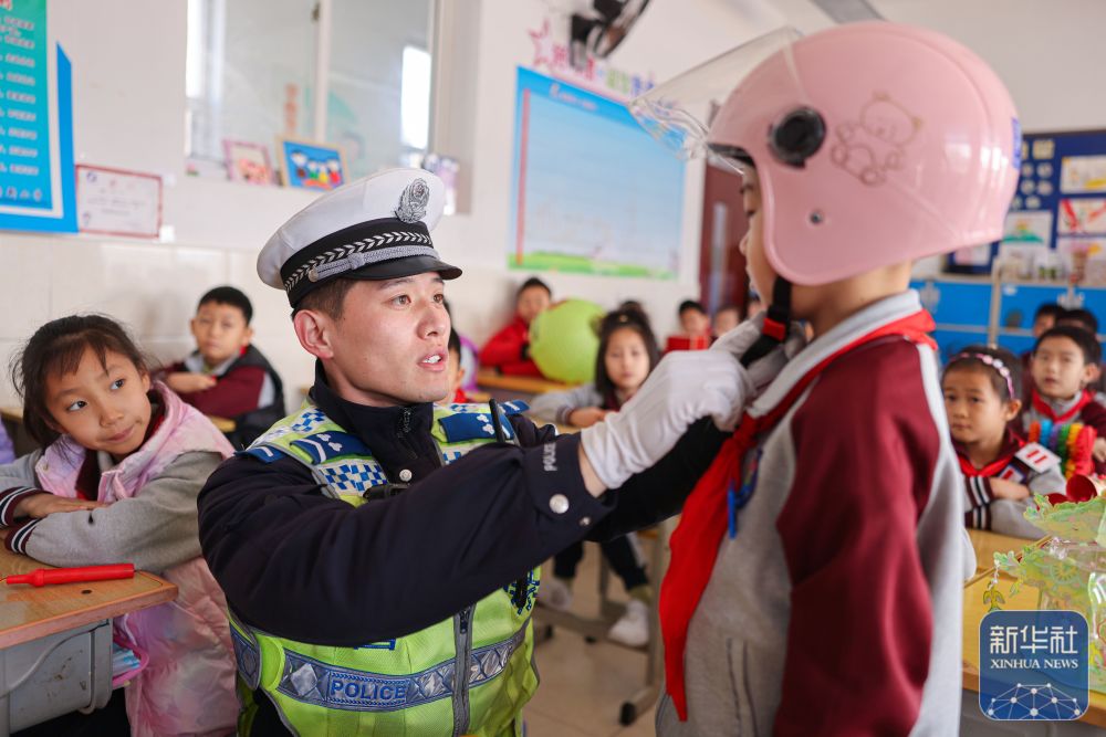 2月14日,在山東(dong) 省榮成市府新小學教室內(nei) ,交警為(wei) 學生講解安全頭盔的正確佩戴方法。新華社發(李信君攝)