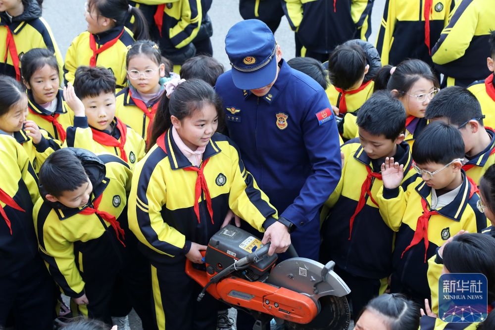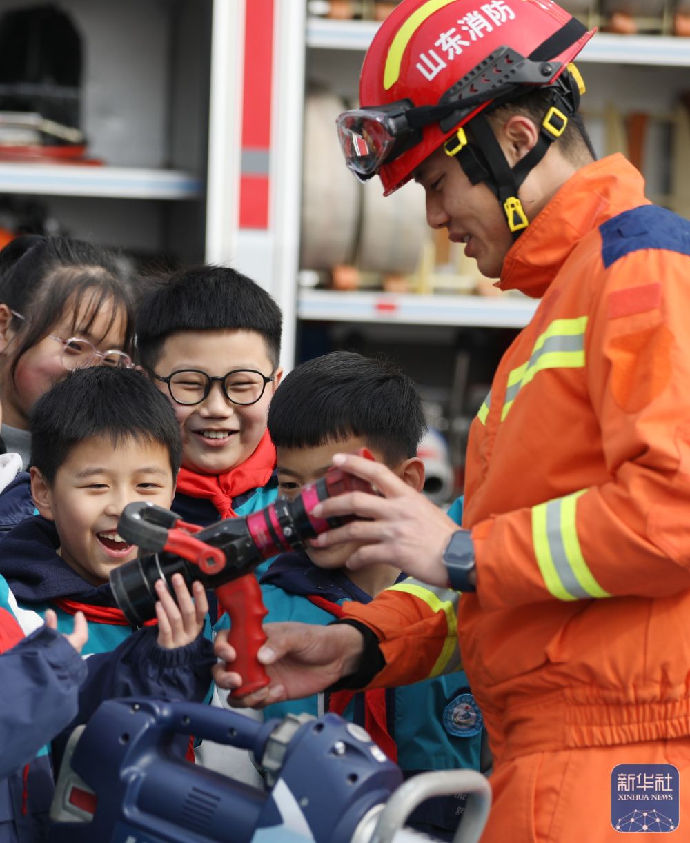 2月14日,在山東(dong) 省棗莊市市中區東(dong) 湖小學,消防員帶領學生們(men) 近距離觸摸消防器材。新華社發(王海楠攝)