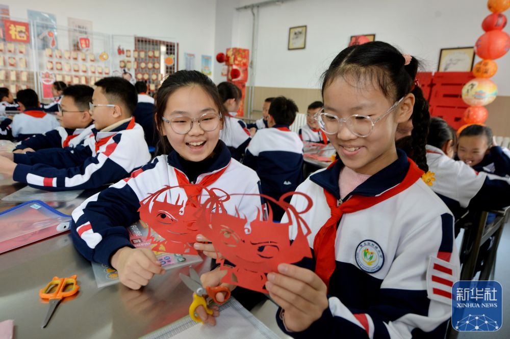 2月14日,兩(liang) 名學生在山東(dong) 青島宜陽路小學“傳(chuan) 統文化潤童心”主題活動中學習(xi) “哪吒”剪紙。新華社發(王海濱攝)