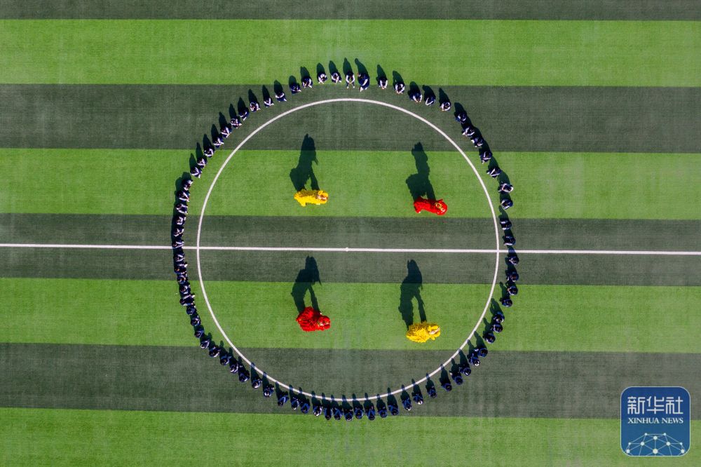 2月14日,山東(dong) 省淄博科技學校龍獅社團的學生在操場上進行舞獅演練(無人機照片)。新華社發(張維堂攝)