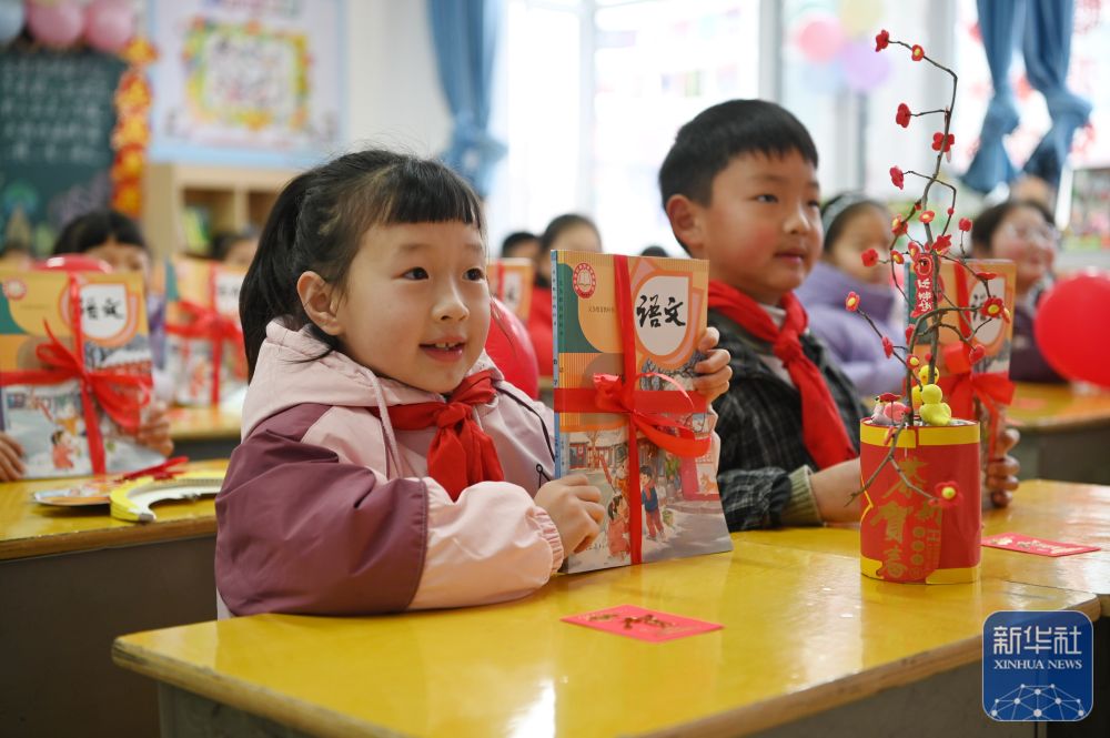 2月14日,在河南省沁陽市朱載堉學校,一年級學生展示領到的新課本。新華社發(楊帆攝)