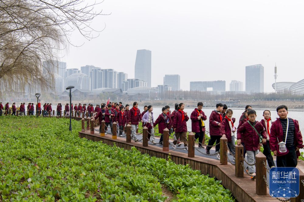2月14日,在浙江省金華市婺城區婺州公園裏,東(dong) 市街小學師生集體(ti) 在三江六岸綠道上快樂(le) 毅行。新華社發(胡肖飛攝)