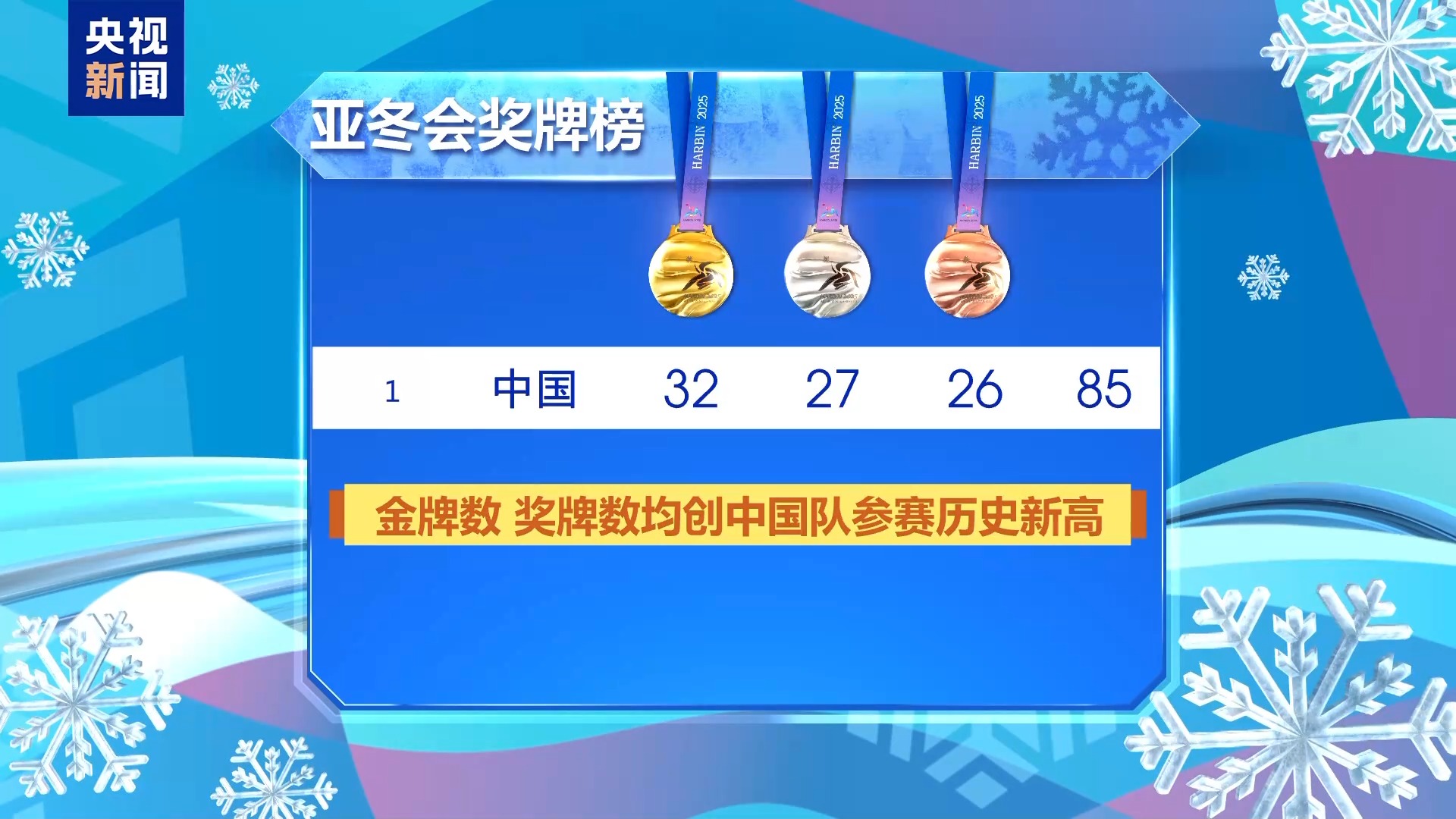本屆亞(ya) 冬會(hui) 中國體(ti) 育代表團參加了全部6個(ge) 大項11個(ge) 分項64個(ge) 小項的比賽,以32金27銀26銅共85枚獎牌,位居金牌榜、獎牌榜首位,金牌數、獎牌數均創中國隊參賽曆史新高。