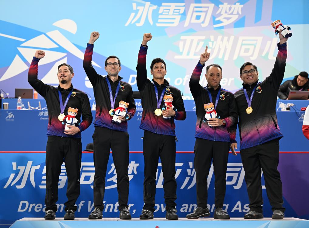 2月14日,第九屆亞(ya) 冬會(hui) 男子冰壺頒獎儀(yi) 式在哈爾濱舉(ju) 行。菲律賓隊獲得冠軍(jun) 。新華社記者 趙子碩 攝