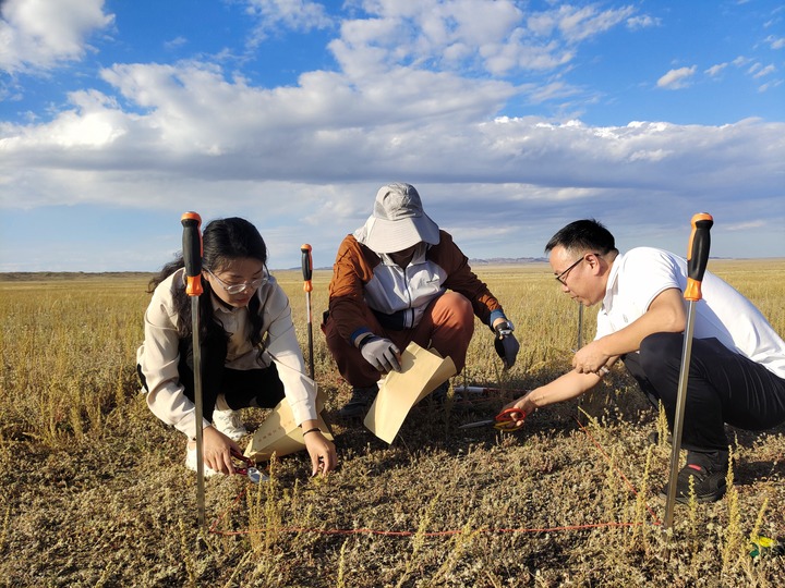 2024年生態質量地麵監測中,薄文真(左一)和同事正在采集植物樣本。(受訪者供圖)