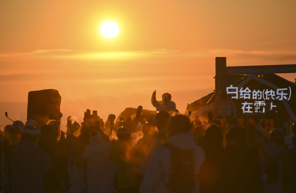 落日餘(yu) 暉灑在阿勒泰市將軍(jun) 山國際滑雪度假區的山頂,漫山白雪被染成橙粉色。在現場電子音樂(le) 強勁的鼓點中,上千名滑雪愛好者歡呼搖擺,在零下十幾度的雪地裏感受“蹦雪迪”的歡快。