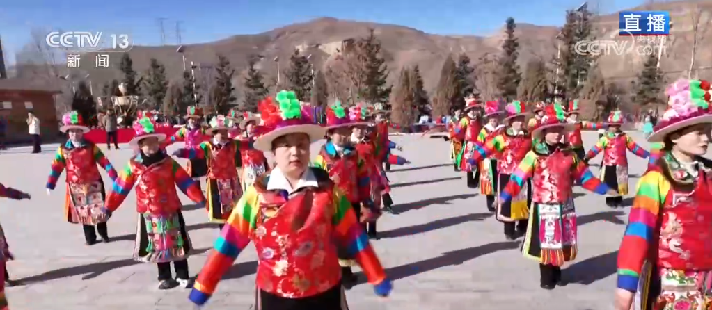 記者來到班彥村的村口廣場看到,三十多位土族姑娘和小夥(huo) 子們(men) 身穿鮮豔的民族服飾,手挽手肩並肩,跳起土族傳(chuan) 統舞蹈——安召舞,為(wei) 即將到來的互助縣農(nong) 曆“二月二”傳(chuan) 統擂台廟會(hui) 暨“非遺宣傳(chuan) 周”展示活動做準備。歡快的節奏真的是非常有感染力,每個(ge) 人身上似乎都洋溢著火一般的熱情。
