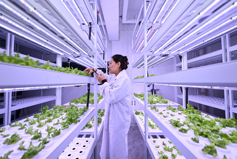 科芯(天津)生態農(nong) 業(ye) 科技有限公司工作人員在實驗室查看農(nong) 作物生長情況。 新華社記者 趙子碩 攝