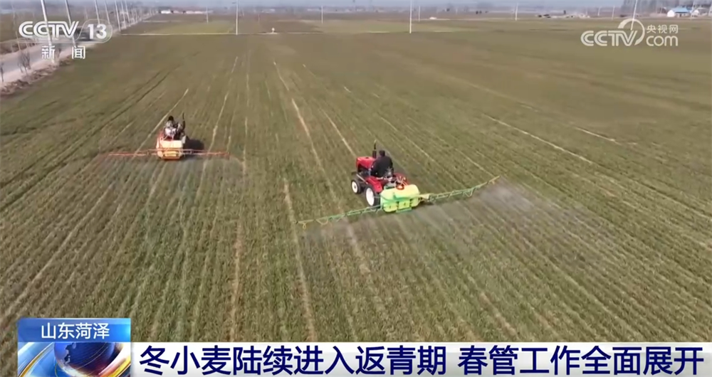 在菏澤市定陶區趙莊村,進入返青期的冬小麥長勢良好。趁著晴好天氣,農(nong) 戶們(men) 駕駛自走式植保機給小麥噴施除草劑。據了解,這種植保機每天能作業(ye) 120畝(mu) ,大大提高了作業(ye) 效率。