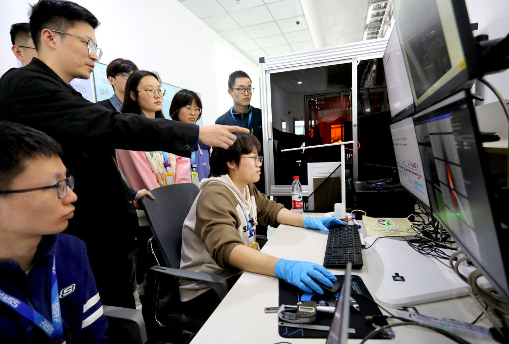 2024年4月10日,安徽省先進功能高分子薄膜工程實驗室團隊成員在上海同步輻射光源實驗線站查看討論實驗數據。