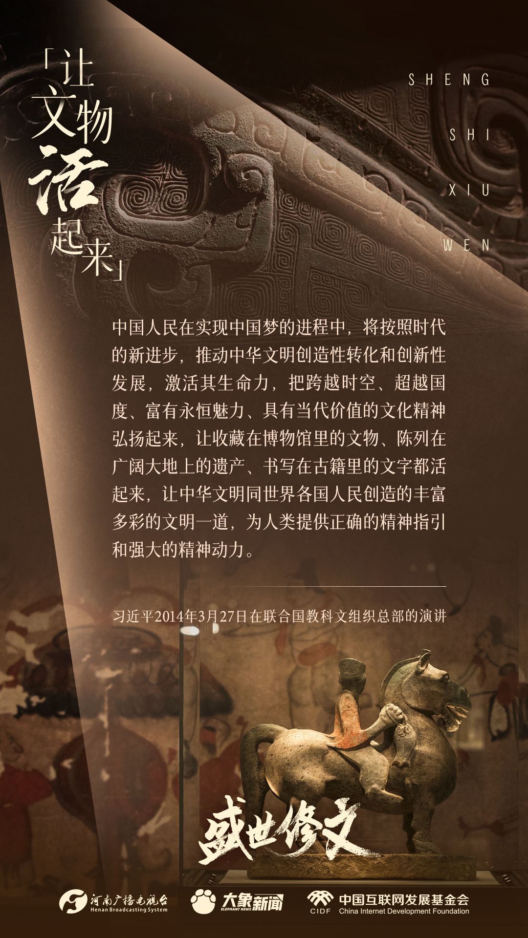 河南廣播電視台大象新聞大型融媒體(ti) 報道《盛世修文》,深入闡釋習(xi) 近平文化思想,著力推進黨(dang) 的創新理論飛入尋常百姓家。