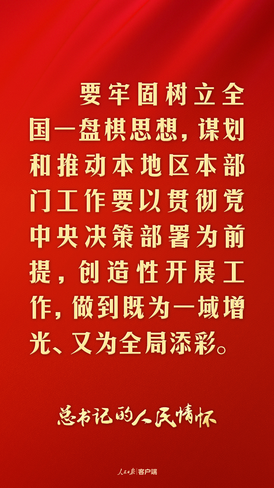 “要牢固樹立全國一盤棋思想,謀劃和推動本地區本部門工作要以貫徹黨(dang) 中央決(jue) 策部署為(wei) 前提,創造性開展工作,做到既為(wei) 一域增光、又為(wei) 全局添彩。”
